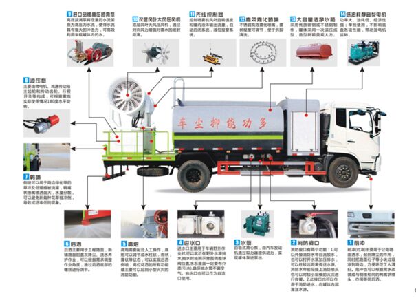 底盤配置:采用東風(fēng)D9系列2315排半寬體駕駛室,選配玉柴200馬力/康明斯210柴油機(jī)器,國六排放標(biāo)準(zhǔn),4500mm軸距,法士特6檔變速箱,4.5噸級前橋/10噸級后橋,295/80R22.5,10.00R20鋼絲胎,方向助力,原裝空調(diào),電動門窗,中控鎖,短氣剎,底盤配置升級,值得期待. 上裝配置:罐體容積12立方,選裝射程60-100米風(fēng)送式霧炮機(jī),罐體鋼板為4mm碳鋼Q235材質(zhì),罐內(nèi)隔板具有防波作用,以減輕汽車行駛時罐體液體沖擊,罐體及整車外形尺寸按照公告。帶大功率專用灑水泵,泵可自吸自排,整車前沖、后灑、側(cè)噴、帶65消防接口,后平臺選配60-100米風(fēng)送式霧炮機(jī)組;汽油或柴油發(fā)電機(jī)組;遠(yuǎn)程遙控系統(tǒng)控制;霧炮自動旋轉(zhuǎn)角度0-360°。后平臺帶綠化灑水炮,水炮揚程≥25米,灑水炮可全方位旋轉(zhuǎn),可連續(xù)調(diào)成直沖狀、大雨、小雨、毛毛雨;前封頭帶水位計,后平臺主管路帶1寸澆花接口,后爬梯。平臺后部帶小安全告知牌:“隨時停車,注意安全”,帶兩根水管及陰陽端。罐體顏色:上白/下藍(lán),銀灰/銀藍(lán),罐體兩側(cè)噴“多功能抑塵車”字樣,貼反光標(biāo)示。