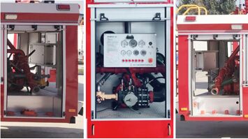 泵房位于整車后部,兩邊與后邊設(shè)鋁合金卷簾門(mén),內(nèi)有照明燈,泵室兩側(cè)可放置部分常用器材
