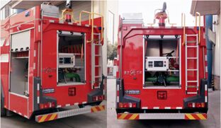 泵房位于整車后部,兩邊與后邊設(shè)鋁合金卷簾門,內(nèi)有照明燈,泵室兩側(cè)可放置部分常用器材